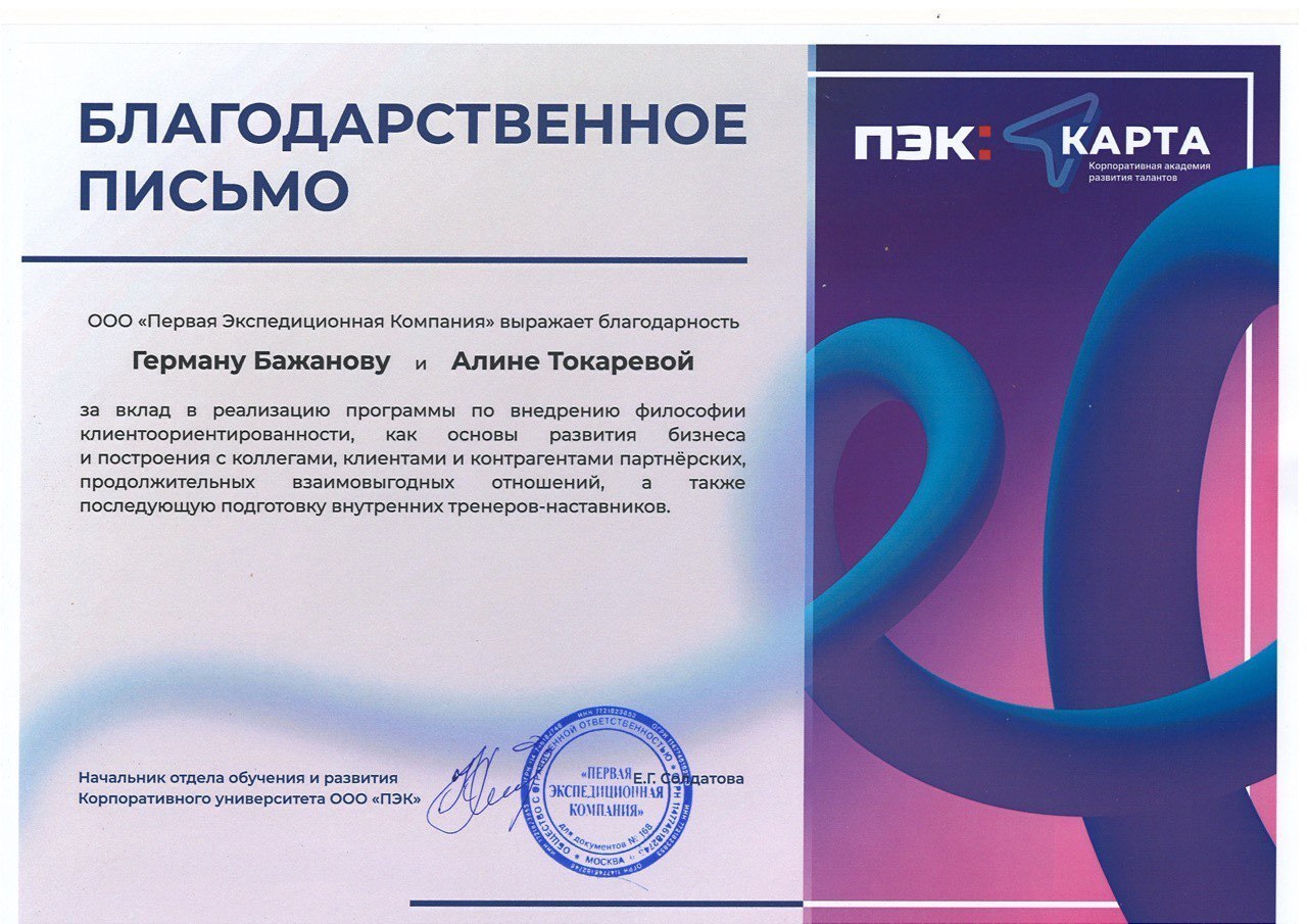Хотел бы выразить искреннюю благодарность Алине и Герману, которые провели программу обучения для наших сотрудников из числа руководителей различного уровня. Эта программа стала настоящим импульсом для развития нашей организации.