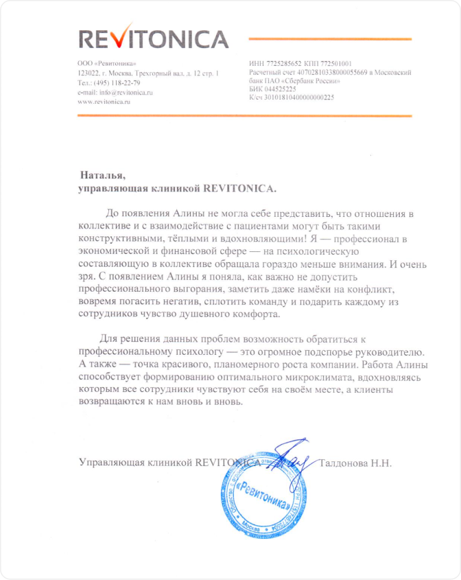 «Хочу выразить огромную благодарность коучу Алине Токаревой за неимоверный вклад в мой личный рост и разбор моего запроса. Алина проявляла себя как исключительный профессионал, позволяя мне открываться, при этом оставаясь в рамках моего запроса.…»